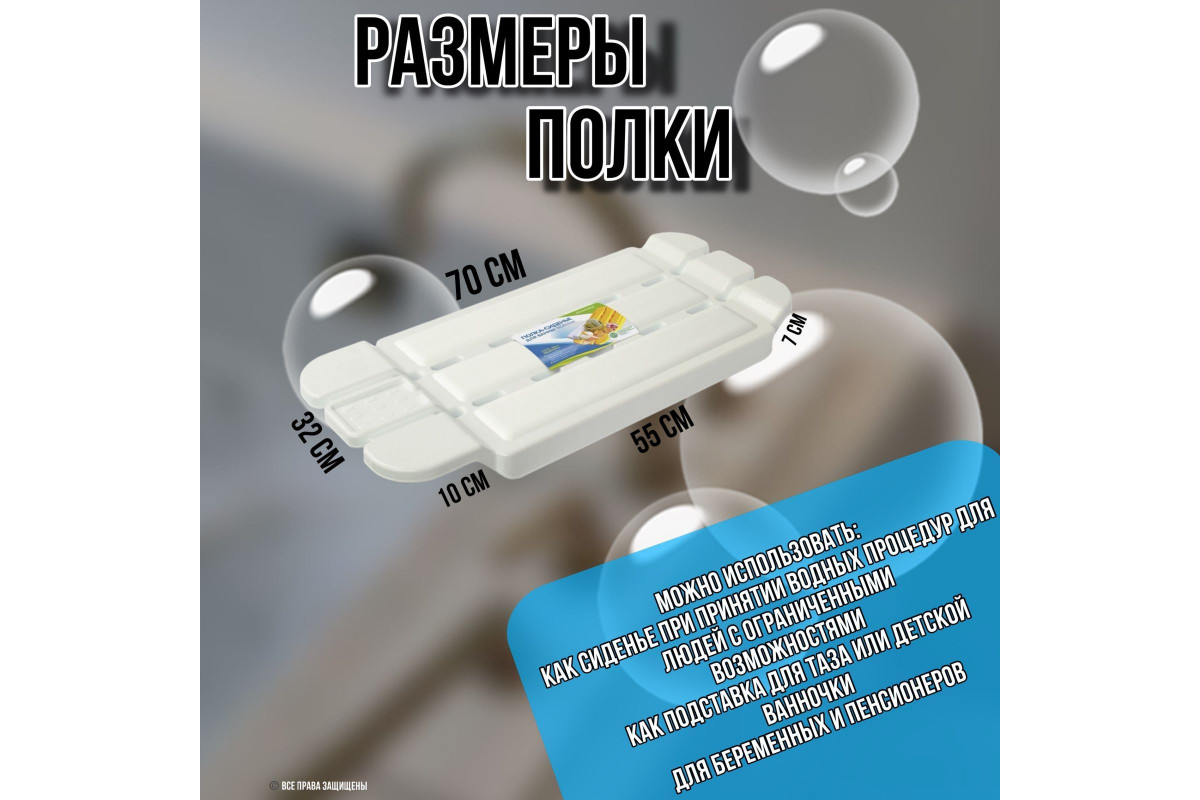 Полка-сиденье выглядит стильно и современно, даже если ваша ванная отделана дорогостоящими материалами. Изготовлена из прочного и экологически чистого пластика, она находит множество применений, включая использование в качестве табурета для гигиенических процедур, что особенно удобно для пожилых людей, беременных женщин или тех, кто имеет ограничения по здоровью. Сиденье также подойдет для мытья домашних животных, использования как подставка для тазов или детских ванночек, а также для хранения банных принадлежностей и сушки обуви.