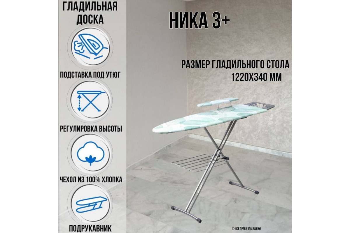 Гладильная доска напольная Ника 3+, 1225 х 345 мм, с плавной регулировка высоты до 85 см, подставка для утюга с проводом габаритные размеры: