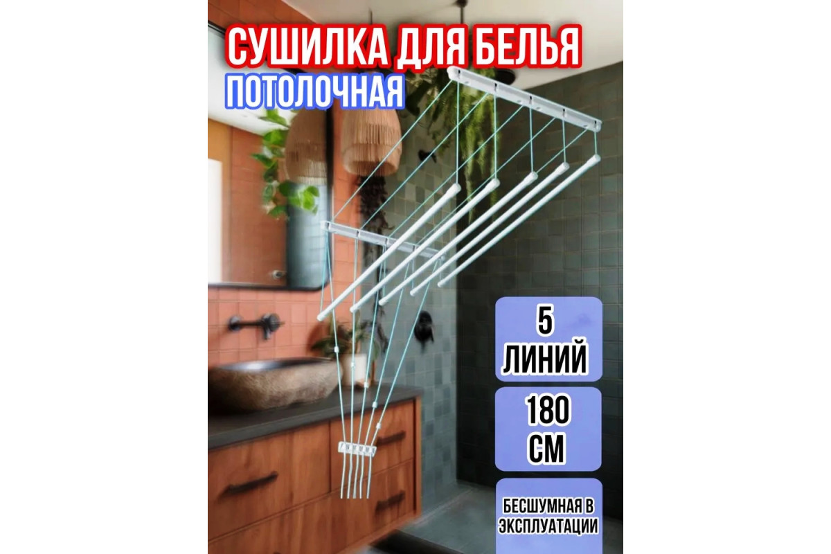 Сушка для белья «Лиана» обеспечит должный уход за вашими вещами. В комплект входят пять прочных металлических штанг, на которых можно разместить бельё, одежду и другие предметы. Потолочная сушка с прочными верёвками экономит пространство и обеспечивает комфорт.