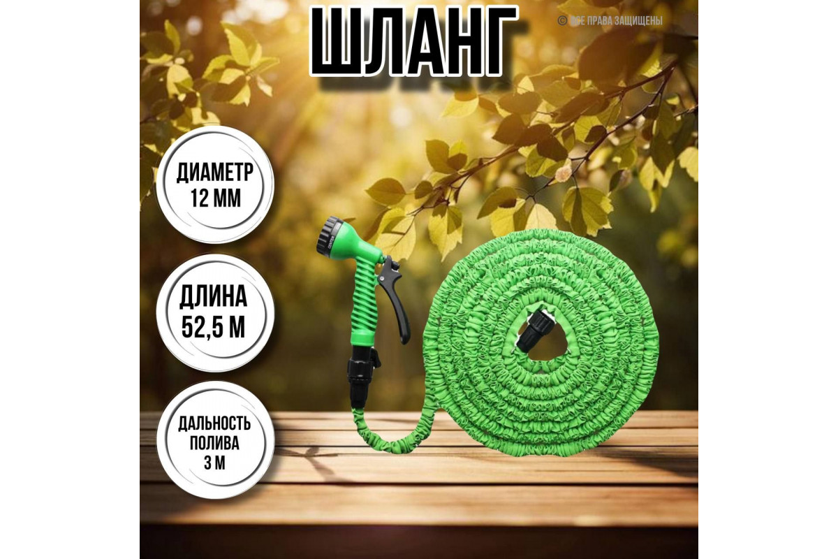Шланг изготовлен из высокопрочного и гибкого материала, который позволяет ему растягиваться до 52.5 метров в длину и сжиматься обратно до компактных размеров для удобного хранения.